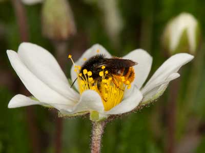 Ein Weibchen von Osmia bicolor auf der Blüte der Weißen Silberwurz (Dryas octopetala).