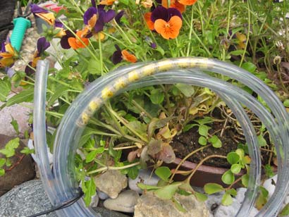 Ein kurioser Platz für die Anlage eines Nestes: In der Windung eines vollkommen durchsichtigen Gartenschlauchs. Aufgrund der späteren Verpilzung in dem gasundurchlässigen Material starb die Brut ab. (Foto: Dieter Gairing).