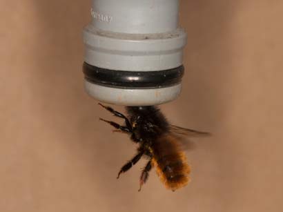Als flexibler Hohlraumbewohner nutzt Osmia cornuta auch vom Menschen für ganz andere Zwecke gedachte Objekte wie Hahnverbindern.