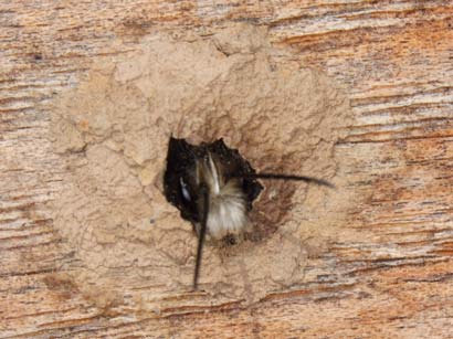 Ein Männchen hat soeben seinen Kokon und den Nestverschluß aus Lehm durchnagt und erblickt zum ersten Mal das Tageslicht.