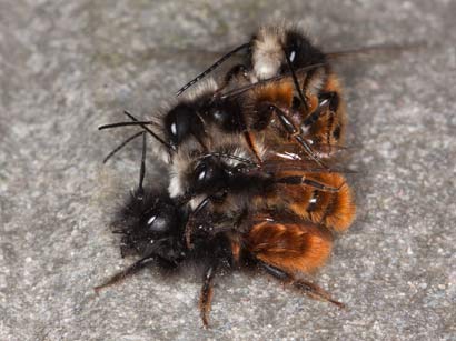 Kaum besuchen die ersten noch unverpaarten Weibchen die Blütenstände der Sal-Weide (Salix caprea) werden sie auch schon von Männchen überfallartig gepackt, aber erst nach längerer Umklammerung begattet.
