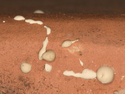 Direkt neben den Nestern oder in ihrem Umfeld sieht man im März oder April solche hellbraunen Flecken. Dabei handelt es sich um den Darminhalt, den jede Mauerbiene bald nach dem Schlüpfen abgibt und der rasch trocknet. Die schlüpfenden Bienen haben Monate in Ruhe im Kokon verbracht und während dieser Zeit hat sich im Darm Kot angesammelt. Die letzte Nahrung haben sie im Larvenstadium aufgenommen.