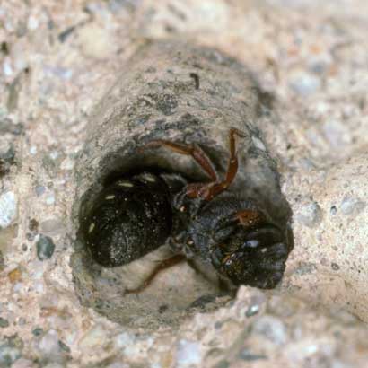 Hier hat sich ein Weibchen zum Schlafen in eine verlassene Brutzelle der Mörtelbiene verkrochen (Wallis, Schweiz).