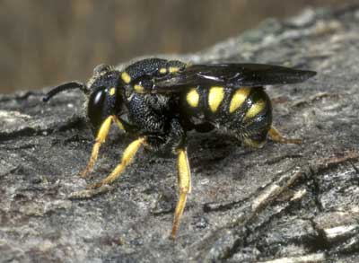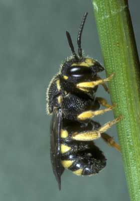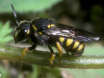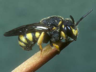 Männchen: 6–7 mm. Auffällig schwarz-gelb gefärbt und dem Weibchen sehr ähnlich, aber zusätzlich Clypeus und Nebengesicht hellgelb gefärbt. Clypeusvorderrand ohne Zähnchen. Weibchen. 6–7 mm. Auffällig schwarz-gelb gefärbt und dem Wirt Anthidium strigatum außerordentlich ähnlich. Die gelben Seitenflecken liegen alle fast am Seitenrand der Tergite, während bei Anthidium strigatum nur die zwei ersten Paare an den Seitenrand stoßen. Dem Weibchen fehlt außerdem eine Bauchbürste. Vorderkante des Clypeus grade. [Großansichten: auf Bild klicken]