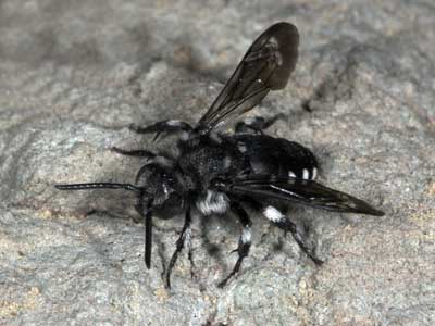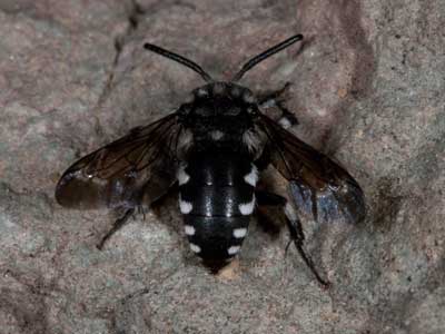 Ein Weibchen von Thyreus orbatus schläft in einer felsigen Vertiefung am Nistplatz von Anthophora plagiata in der Schweiz.