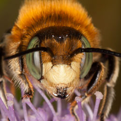 Ein Weibchen von Anthidium punctatum hat Pflanzenhaare einer Golddistel (Carlina vulgaris) geerntet.