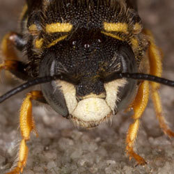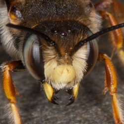 Ein Weibchen von Anthidium byssinum transportiert einen Brocken Harz in seinen Mandibeln.