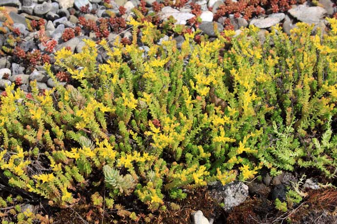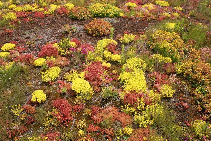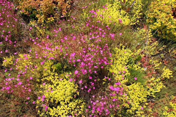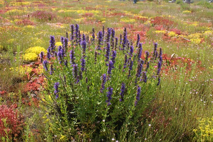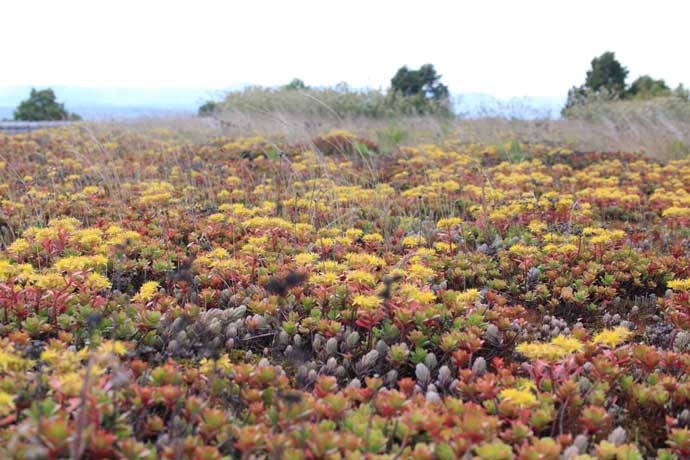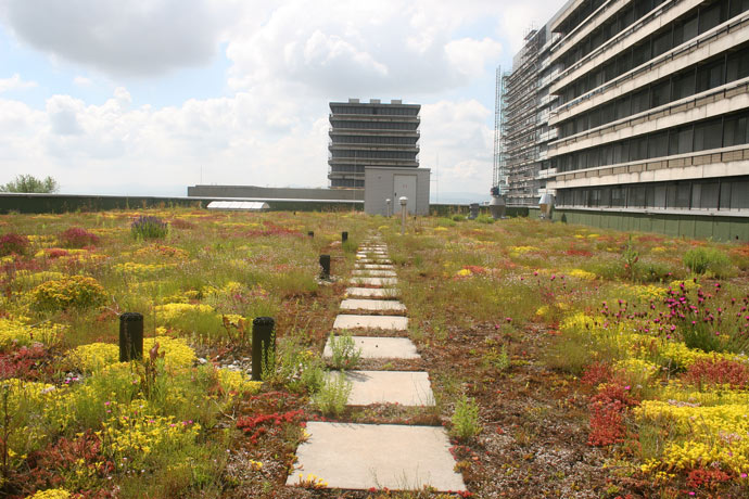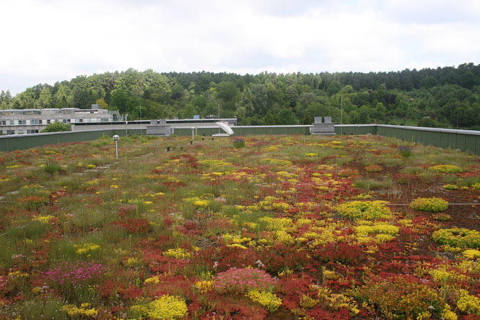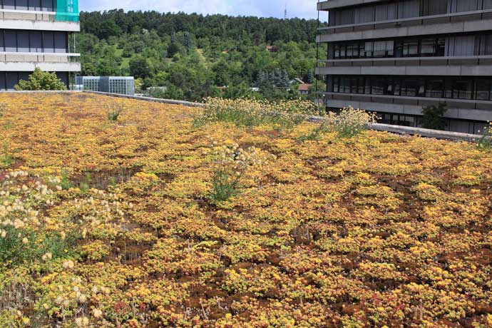 Flachdach des H-Gebäudes mit Blick nach Südosten (26. Juni). Es blühen Scharfer Mauerpfeffer (Sedum acre) (gelb) und Heide-Nelke (Dianthus deltoides) (rot).