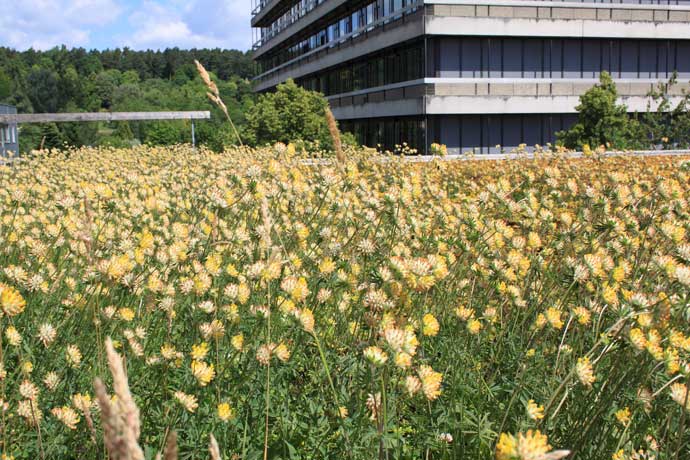 Im Frühjahr hatte ich bei der Staatlichen Vermögens- und Hochbauverwaltung Baden-Württemberg beantragt, begrünte Flachdächer von Gebäuden der Universität Tübingen auf der Morgenstelle begehen und auf die Anwesenheit von Wildbienen kontrollieren zu dürfen. Freundlicherweise wurde mir die Genehmigung unter bestimmten Auflagen erteilt. Am 12. Juni war ich erstmals auf den Flachdächern des großen Hörsaalgebäudes, die vor rund 30 Jahren begrünt wurden; eine weitere Begehung erfolgte am 17. Juni. Heute nun bekam ich die Gelegenheit, auch das Dach eines erst vor wenigen Jahren errichteten Gebäudes (H-Bau) aufzusuchen, das erst vor etwa vier Jahren begrünt wurde. Meine fotografischen Eindrücke und die Bienenarten, die ich während der drei Besuche beobachtet habe, möchte ich nachfolgend präsentieren.