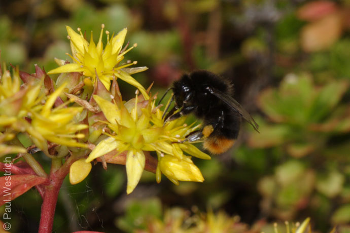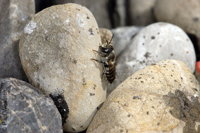 Links: Ein Männchen von Anthidium oblongatum (Spalten-Wollbiene) sonnt sich auf einem Kiesel des Flachdachs. Rechts: Ein Weibchen von Megachile rotundata (Luzerne-Blattschneiderbiene) verköstigt sich mit Nektar am Scharfen Mauerpfeffer (Sedum acre).