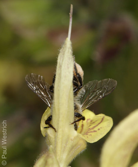 Die obigen Fotos zeigen weitere Eindrücke von der Pollenernte von Megachile ligniseca. Die Art ist allerdings nicht auf Salvia glutinosa spezialisiert. Aufgrund von Pollenanalysen sind mir bislang Vertreter von fünf Pflanzenfamilien als Pollenquellen bekannt geworden (Korbblütler, Kardengewächse, Schmetterlingsblütler, Lippenblütler, Wegerichgewächse). Schremmer hat auch den Nektarraub dieser Art an Salvia glutinosa beschrieben.
