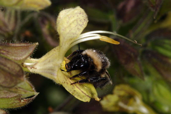 Hummeln mehrerer Arten sind die häufigsten Besucher an Salvia glutinosa. Die häufigste an obiger Lokalität beobachtete Hummelart war Bombus hortorum (Gartenhummel). Als langrüsselige Art ist sie in der Lage, die Salbei-Blüten auf normalem Wege zu nutzen.