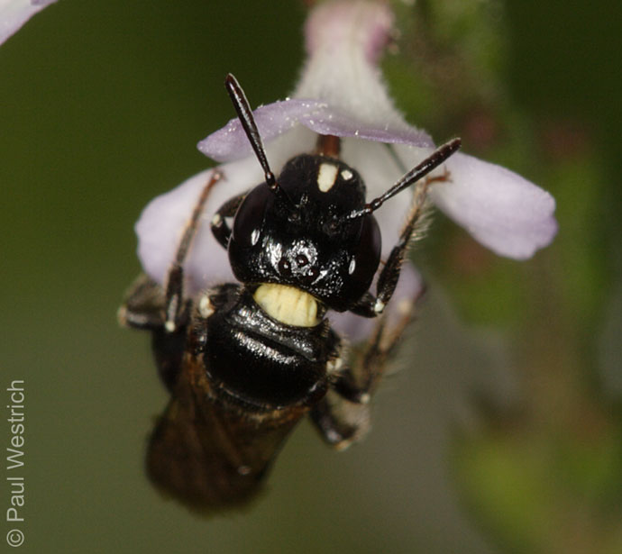 Das 5–6 mm große Männchen von Ceratina cucurbitina ist an dem unten seitwärts erweiterten, weißen Fleck auf dem Kopfschild zu erkennen. An den Hinterbeinen fehlen ihm auch die Transporthaare für den Pollen, da es sich ja nicht an der Brutversorgung beteiligt. Ansonsten ist es wie das Weibchen überwiegend schwarz gefärbt und stark glänzend. Das obige Männchen entstammt offensichtlich bereits einem diesjährigen Nest. – [Großansicht: Auf ein Bild klicken.]