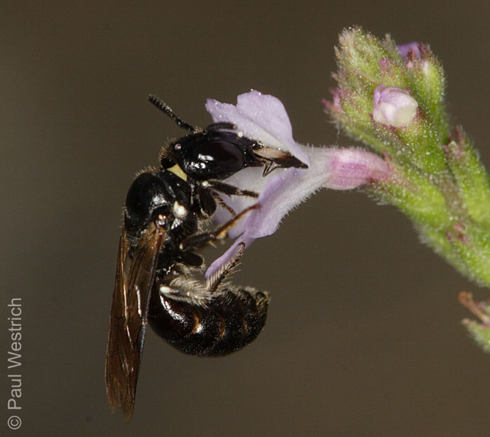 Im Rahmen der Bearbeitung der Wildbienenfauna eines Rebhanges am Rande des Kraichgaus bei Weingarten (Baden) fielen mir am Wegrand einige Exemplare des Eisenkrauts (Verbena officinalis) auf, die von kleinen Bienen besucht wurden. Beim näheren Hinsehen stellte ich fest, daß es sich um Männchen und Weibchen der Schwarzglänzenden Keulhornbiene (Ceratina cucurbitina) handelte, die ich bislang an dieser Pflanze nicht beobachtet hatte.