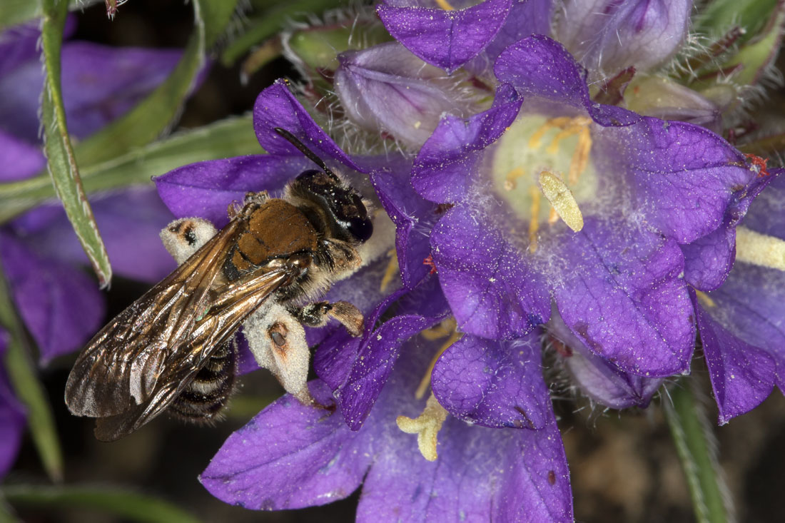 Andrena curvungula: Um 13.00h begann ein Weibchen intensiv Pollen zu sammeln, wobei es an zwei Blüten gut eine Minute beschäftigt war, an einer dritten Blüte ca. 30 Sekunden. Eine Zeitlang später beobachtete ich ein Weibchen (dasselbe?) ganz in der Nähe bei der Pollenernte an Campanula rotundifolia (Rundblättrige Glockenblume).