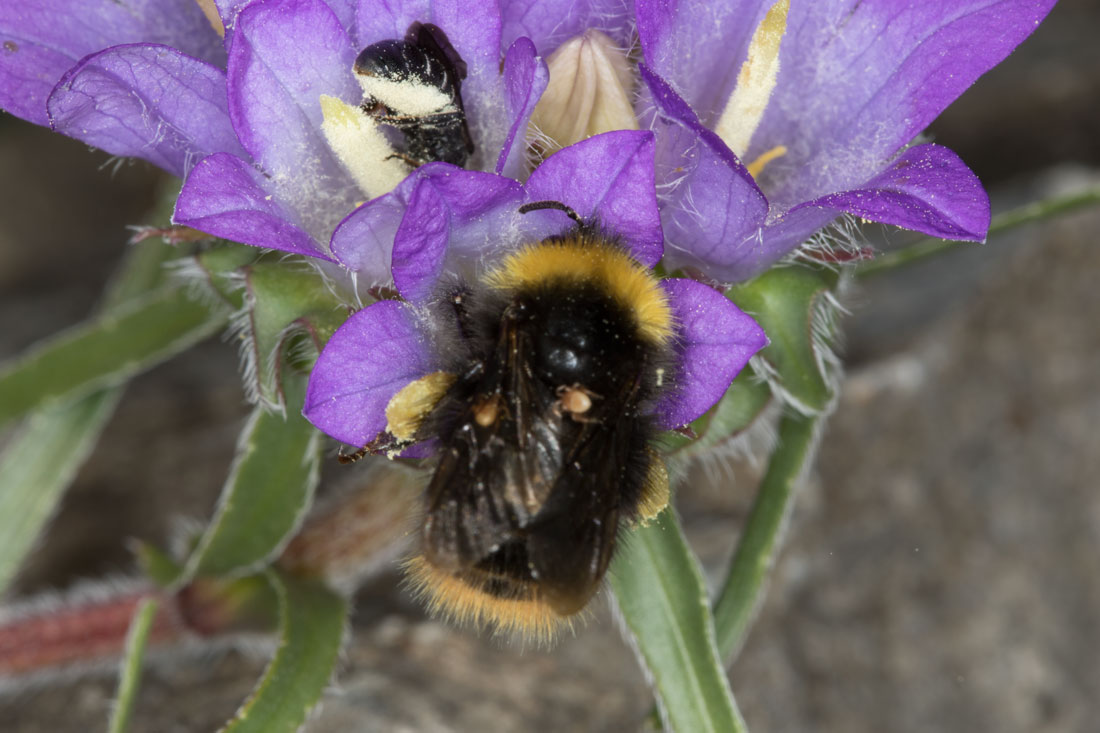 Vor wenigen Tagen hat im Botanischen Garten der Universität Tübingen im Alpinum ein kleiner Bestand der Grasblättrigen Büschelglocke (Edraianthus graminifolius) zu blühen begonnen. Schon vor 30 Jahren (Westrich 1989) habe ich mich bei meinen blütenökologischen Studien mit Edraianthus beschäftigt, vor allem im Vergleich zu Campanula. Ich hatte damals Edraianthus-Arten kultiviert und die Wildbienenarten, die sie besuchen, erfaßt. Für Chelostoma campanularum konnte ich zeigen, daß die Weibchen bei der Wahl der Pollenquellen nicht zwischen Campanula und Edraianthus unterscheiden. Um meine Erfahrungen zu bereichern, habe ich an mehreren Tagen über mehrere Stunden die Blüten beobachtet und die Besucher registriert, fotografiert und gefilmt.