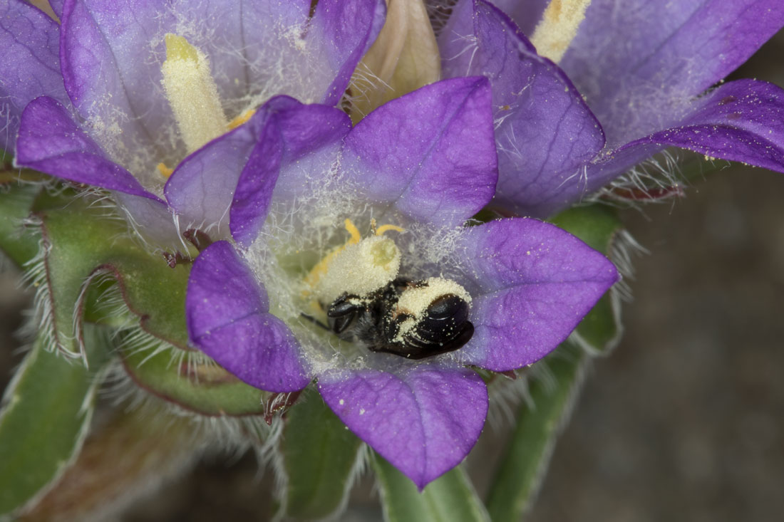 Chelostoma rapunculi: Ein Weibchen besuchte eine frisch aufgeblühte Blüte, bei der sich noch der meiste Pollen auf der Griffelstange befand. Es konnte mit dem Pollen dieser einen Blüte fast seine gesamte Bauchbürste füllen.