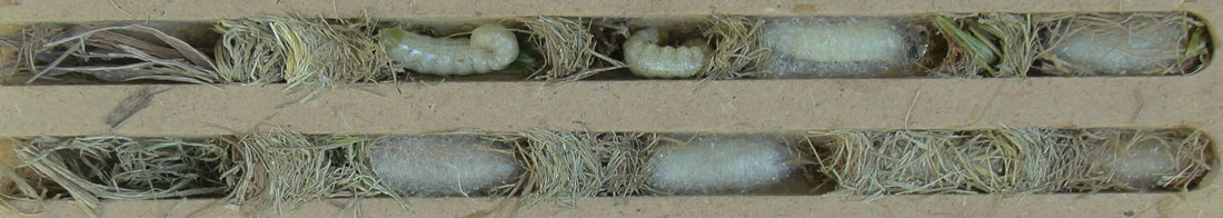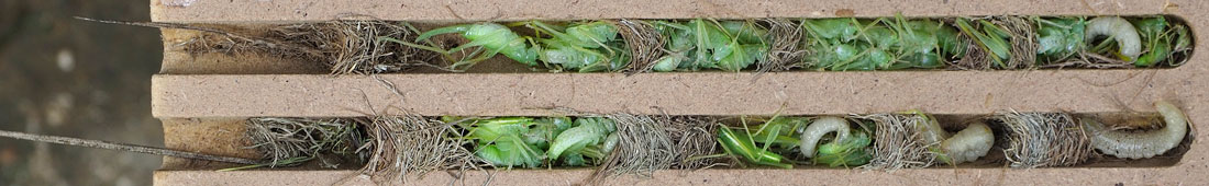 Zwei Nester in einem Gang von 8 mm Durchmesser in einem frühen Stadium, in dem die Beutetiere gefressen werden, und nach dem Verzehr des Larvenfutters mit ausgewachsenen oder bereits eingesponnen Larven. Die Zwischenwände zwischen den einzelnen Brutzellen bestehen aus dicht gepackten Grasblättern (Aufnahmen von 2020).