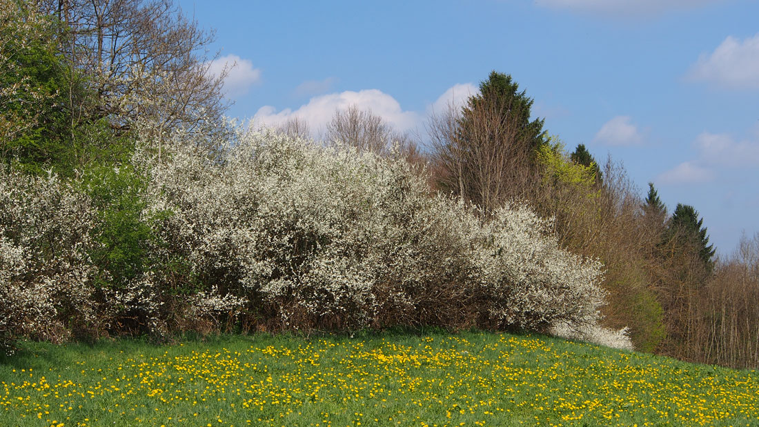 Auch Hecken mit vorgelagertem Wirtschaftsgrünland gehören zu den Lebensräumen von Andrena haemorrhoa. Hier sind alljährlich einzelne Individuen dieser Sandbiene an Schlehen oder auf Löwenzahn zu beobachten (Schwäbische Alb). [Für Großansicht auf Bild klicken]