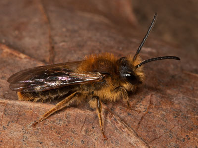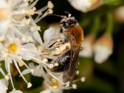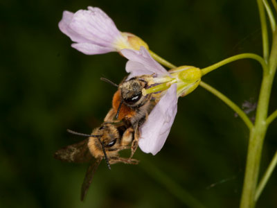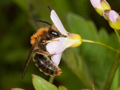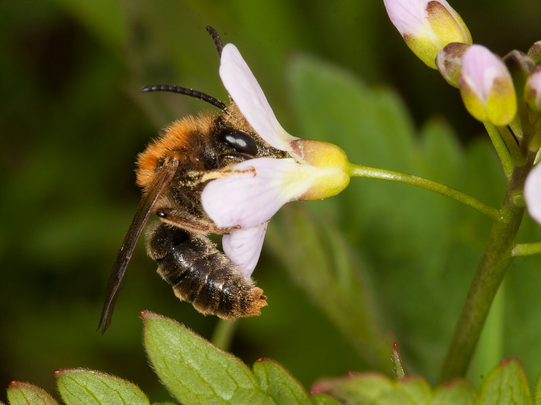 Andrena haemorrhoa. Frisch geschlüpftes Männchen auf der Blüte des Wiesen-Schaumkrauts (Cardamine pratensis).