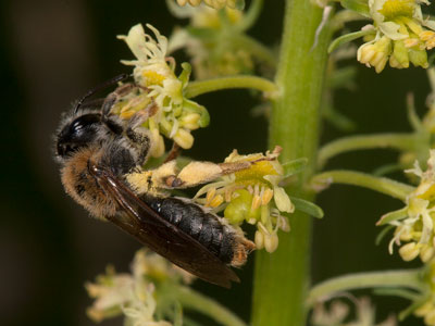Andrena haemorrhoa, Weibchen bei der Pollenernte an Wilder Resede (Reseda lutea).