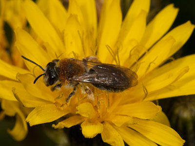 Andrena haemorrhoa, Weibchen im Köpfchen des Wiesen-Pippaus (Crepis biennis).