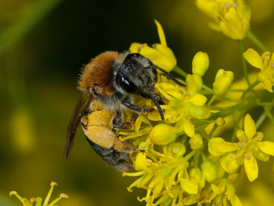 Weibchen von Andrena haemorrhoa sammelt Pollen im Blütenstand des Färberwaids (Isatis tinctoria).