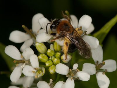 Weibchen bei der Pollenernte auf der Knoblauchsrauke (Alliaria petiolata).
