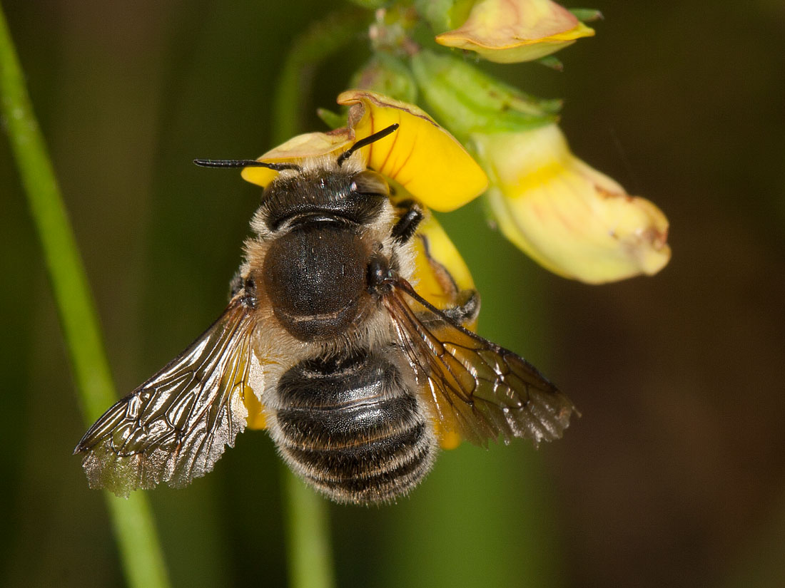 Oligolektische, auf Fabaceae (Schmetterlingsblütler) spezialisierte Art (Müller 1996a, Westrich 1990). Hauptpollenquelle ist der Gewöhnliche Hornklee (Lotus corniculatus). Insbesondere dort, wo dieser nur vereinzelt oder gar nicht blüht, wird auch an anderen Fabaceen Pollen gesammelt. Belegt sind: Sumpf-Hornklee (Lotus pedunculatus), Futter-Esparsette (Onobrychis viciifolia), Kriechende Hauhechel (Ononis repens), Dornige Hauhechel (Ononis spinosa), Vogel-Wicke (Vicia cracca), Verschiedenblättrige Platterbse (Lathyrus heterophyllus), Wald-Platterbse (Lathyrus sylvestris), Knollen-Platterbse (Lathyrus tuberosus), Wiesen-Platterbse (Lathyrus pratensis), Luzerne (Medicago sativa), Bunte Kronwicke (Coronilla varia). Müller (1996) fand in den Pollenladungen auch Pollen anderer Pflanzenfamilien, jedoch in einem Anteil von unter 5%. – Die Weibchen zeigen meist eine hohe Blütenstetigkeit, insbesondere wenn sie an Lotus sammeln, oft werden aber auch zwei, gelegentlich auch drei Pflanzenarten während eines Sammelfluges genutzt. Alle genannten Pollenquellen außer Ononis und Coronilla bieten auch Nektar, der dem Larvenproviant reichlich beigemischt wird. Die Männchen patrouillieren häufig an Lotus.