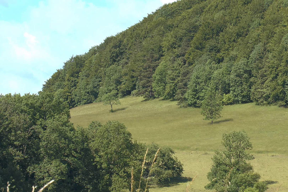 Ausgedehnter, regelmäßig im Sommer von Schafen beweideter Kalkmagerrasen auf der Schwäbischen Alb (bei Gönningen, ca. 800m üNN). Der Magerrasen liefert Nistplatz und Futterquellen, der Waldrand das benötigte Baumaterial. [Für Großansicht auf Bild klicken]
