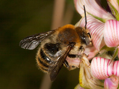 Anthidium byssinum. Ein Männchen trinkt Nektar in der Blüte der Futter-Esparsette (Onobrychis viciifolia).