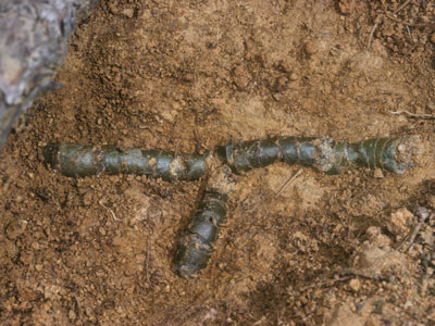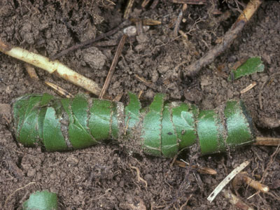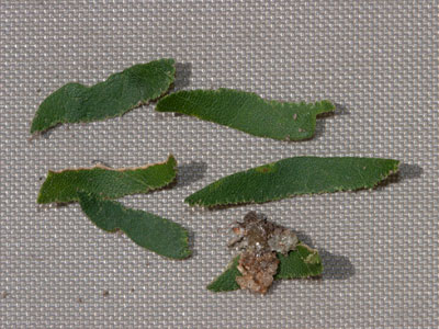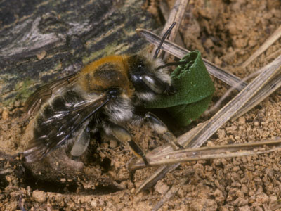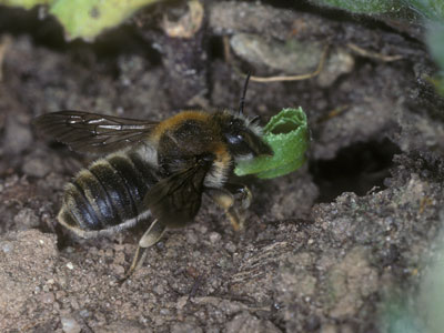 Das Weibchen beim Eintragen eines Blattstreifens, der spiralig aufgerollt mit den Oberkiefern transportiert wird.