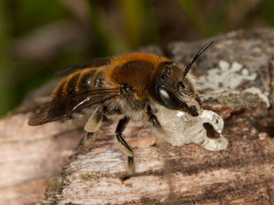 Der Harzbrocken, den das Weibchen für die Herstellung der Brutzelle benötigt, klebt unter dem Kopf. Er wird im Flug zum Nistplatz gebracht und in die Niströhre eingetragen und dort nach dem Einbringen der Blattstreifen verarbeitet.