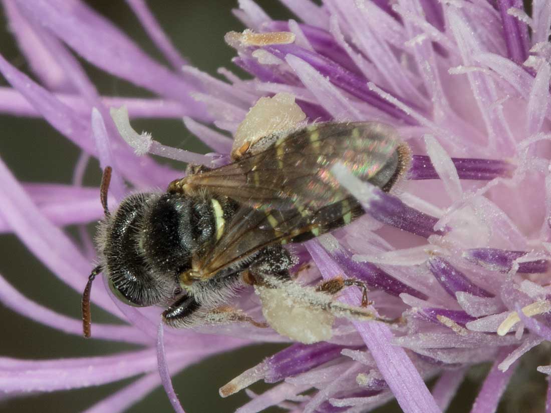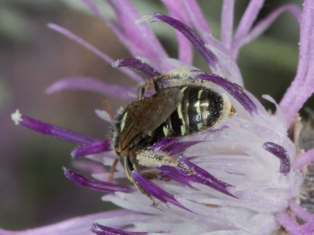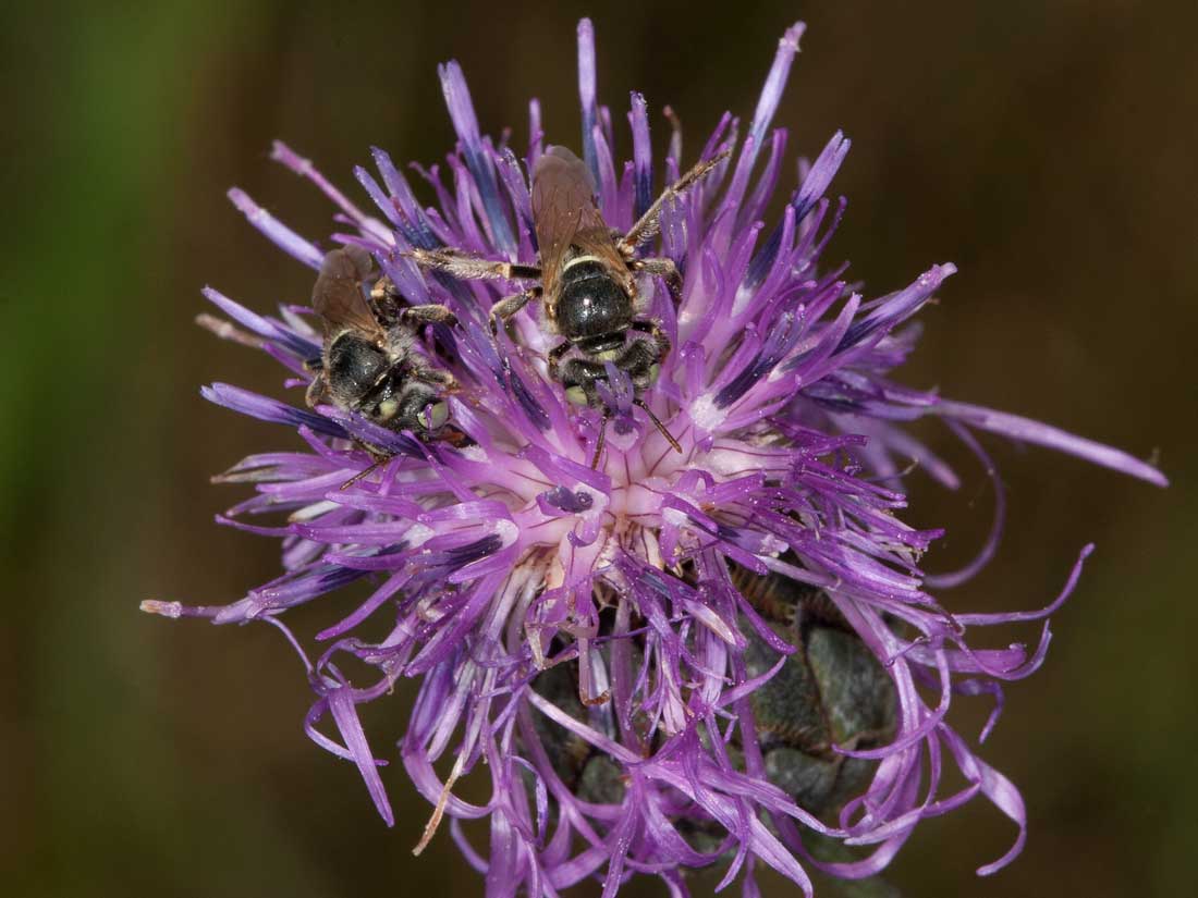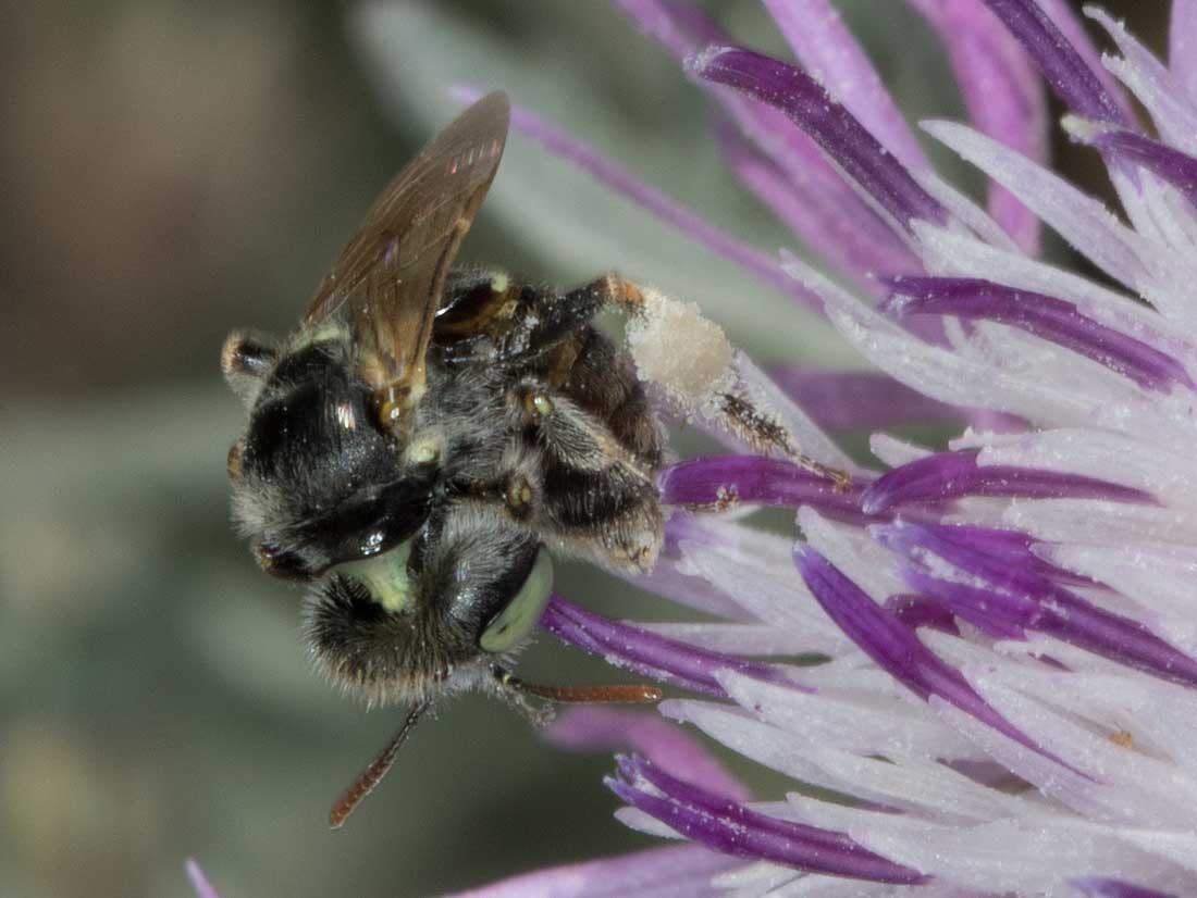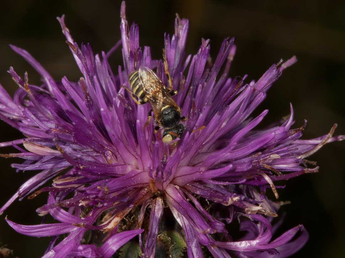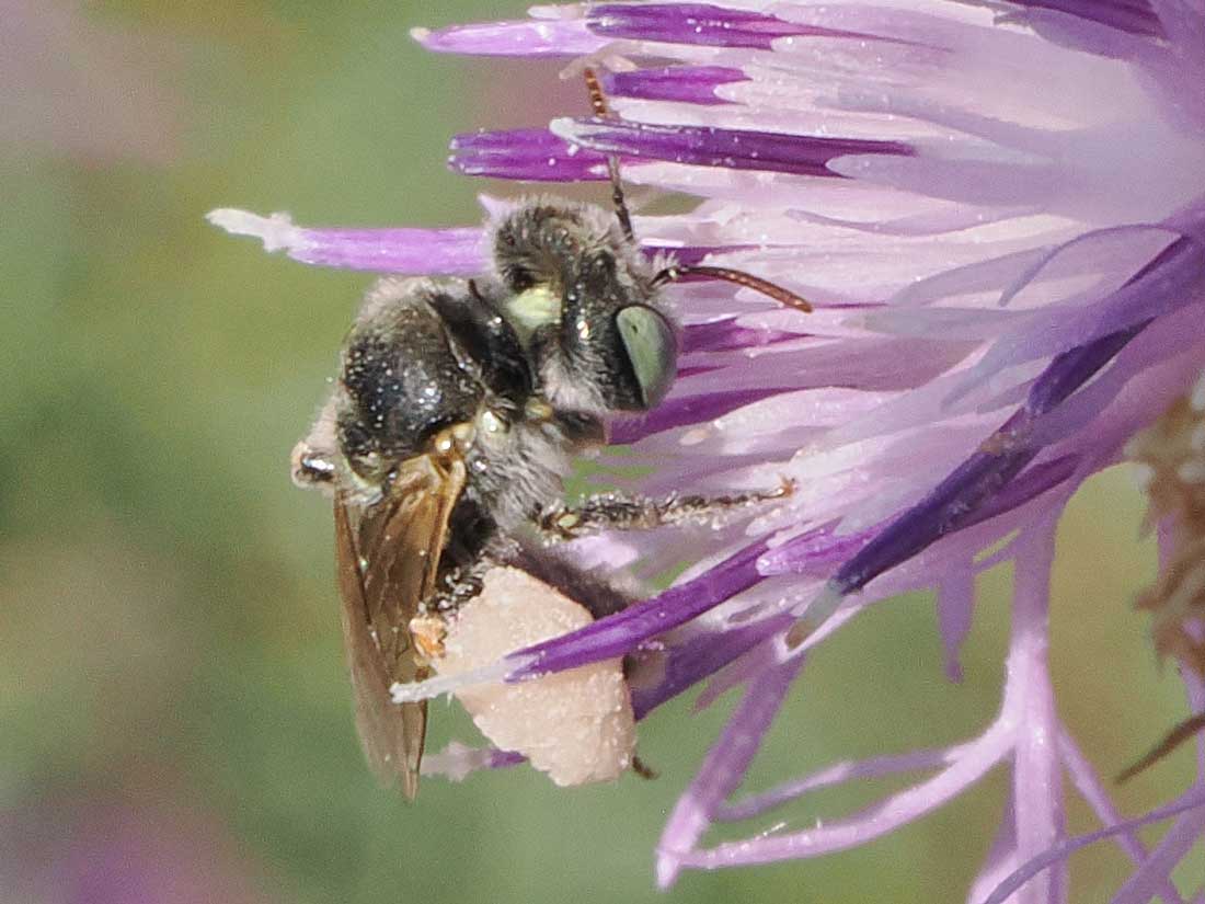 Ein Weibchen von Camptopoeum friesei hat an der Rispen-Flockenblume (Centaurea stoebe) noch nicht viel Pollen gesammelt (Latdorf).