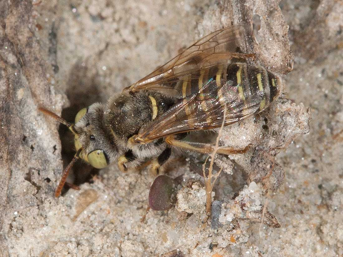 Ein Männchen von Camptopoeum friesei inspiziert ein Nest in Erwartung eines schlüpfenden Weibchens (Neusiedlersee, Österreich). Die Männchen halten sich tagsüber überwiegend am Nistplatz auf, wo sie über den Nestern schwärmen und zwischendurch vor oder neben den Nesteingängen landen, bevor sie meist nach wenigen Sekunden wieder ihre Flugaktivitäten aufnehmen.