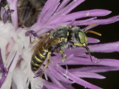 Ein Männchen von Camptopoeum friesei trinkt Nektar im Blütenstand einer Flockenblume (Neusiedlersee, Österreich). [Für Großansicht auf Bild klicken]