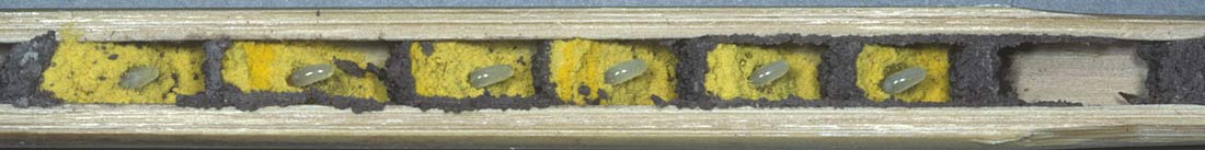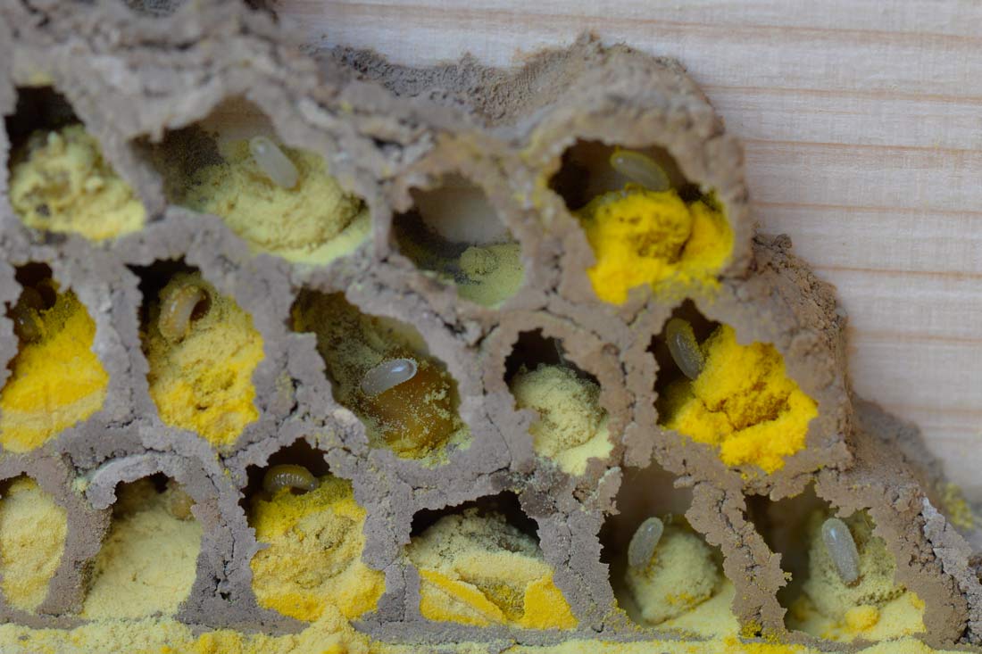 Wenn röhrenartige Hohlräume nicht vorhanden sind, werden von Osmia bicornis auch andere als Nistplatz genutzt wie hier in einem Begattungskästchen für Honigbienen. Hier sind die Brutzellen traubenartig aneinandergebaut.