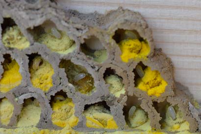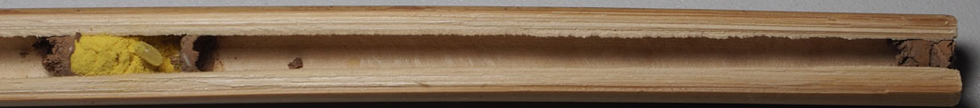 Nest mit 6 Brutzellen in einem Bambusrohr mit ca. 6 mm Innendurchmesser. Die Brutzellen und auch Teile der Seitenwände wurden mit Lehm gebaut. Der Nesteingang liegt am rechten Ende des Bambusröhrchens. (Klick für größere Ansicht.)
