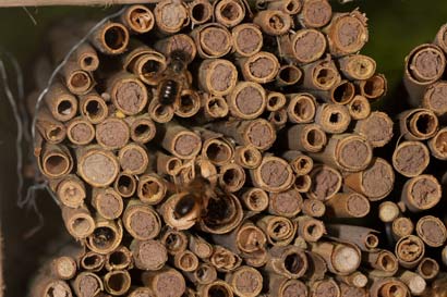 In diesem als Nisthilfe angebotenen Bündel Schilfhalme haben bereits zahlreiche Weibchen Nester angelegt und mit Lehm verschlossen. (Klick für Großansicht).