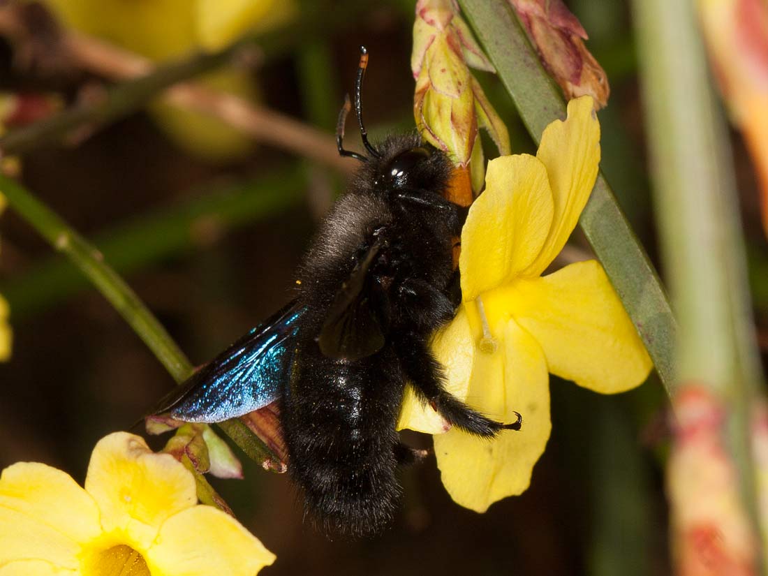 Hier besucht ein Männchen den Winterjasmin (Jasminum nudiflorum). Näheres hierzu auf dieser Tagebuchseite.