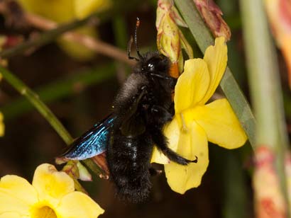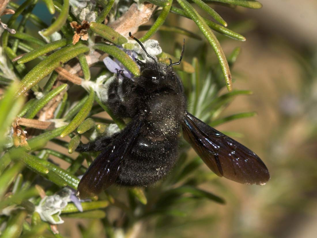 Manchmal tauchen Holzbienen (hier ein Männchen) an sonnigen und etwas wärmeren Tagen der Monate Januar und Februar in Wintergärten auf, um sich dort an den Blüten des Rosmarins zu verköstigen. Sie verkriechen sich anschließend wieder in ihrem Winterquartier, einer Höhlung in einer Hauswand oder dergleichen.