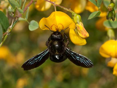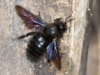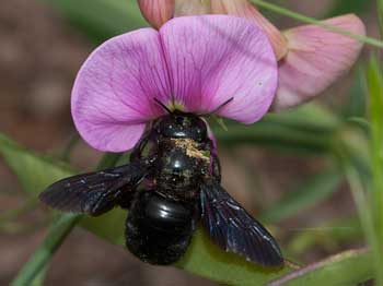 Männchen der Holzbiene sind am Thorax und dem ersten Hinterleibs-Segment oft stark mit Milben besetzt, die bei der Paarung auf das Weibchen übertragen werden und so ins Nest gelangen.