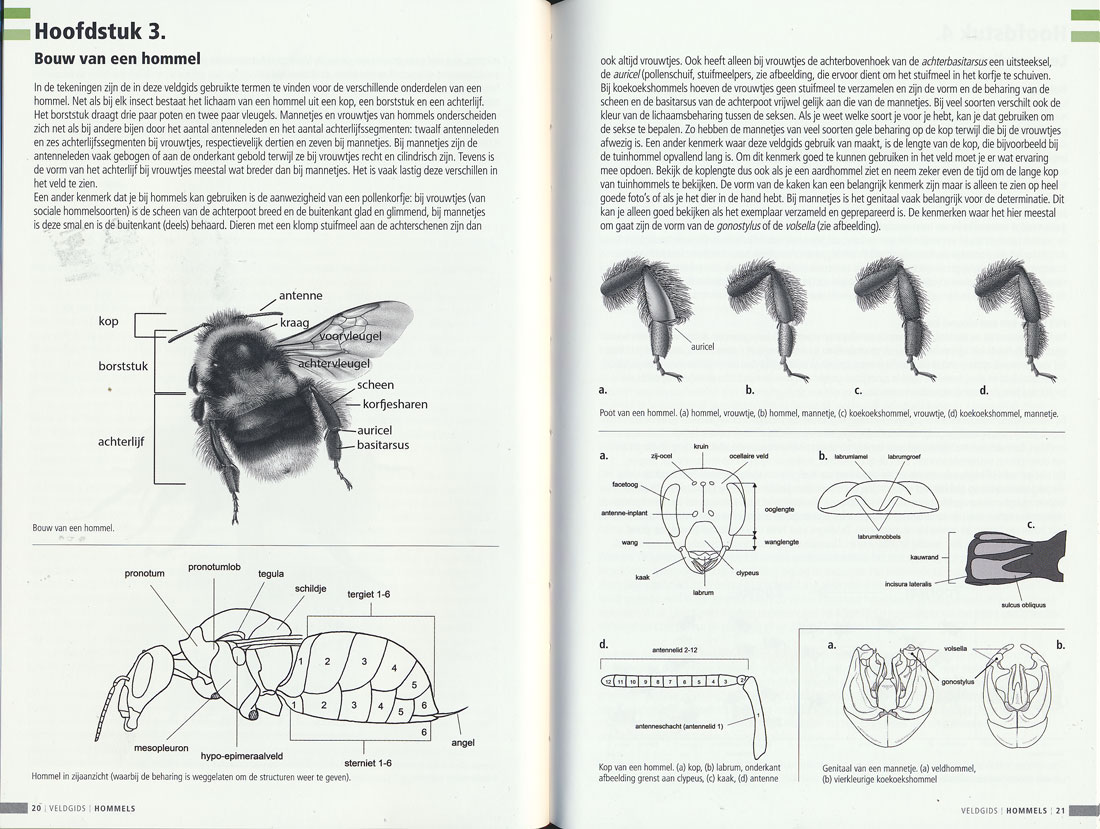 Die ersten sechs Kapitel enthalten Informationen zum Erkennen, zur Morphologie, zu Lebensweise, Gegenspielern und Lebensräumen sowie zu weiterführender Literatur. Es folgen zwei Kapitel mit einer Übersicht der wichtigsten im Feld erkennbaren Farbmerkmale, gefolgt von einem mit zahlreichen Zeichnungen und Detailfotos illustrierten dichotomen Bestimmungsschlüssel. Kapitel 9 stellt in alphabetischer Reihenfolge der niederländischen Hummelnamen auf Doppelseiten alle aus den Niederlanden und Belgien bekannt gewordenen Arten in Fotos und Farbzeichnungen dar. Dem niederländischen Trivialnamen ist der wissenschaftliche Name beigefügt. Der Steckbrief beschreibt Weibchen und Männchen und gibt Hinweise zu ähnlichen Arten, Vorkommen, Lebensraum und Lebensweise. Nicht enthalten sind verständlicherweise die Hummelarten der europäischen Alpen. Ergänzend finden sich Farbtafeln mit sehr schönen Farbzeichnungen von Weibchen und Männchen der Hummeln und typischer Farbvarianten. Es folgt eine Doppelseite mit Zeichnungen der männlichen Genitalien sowie ein Namens- und Sachregister.