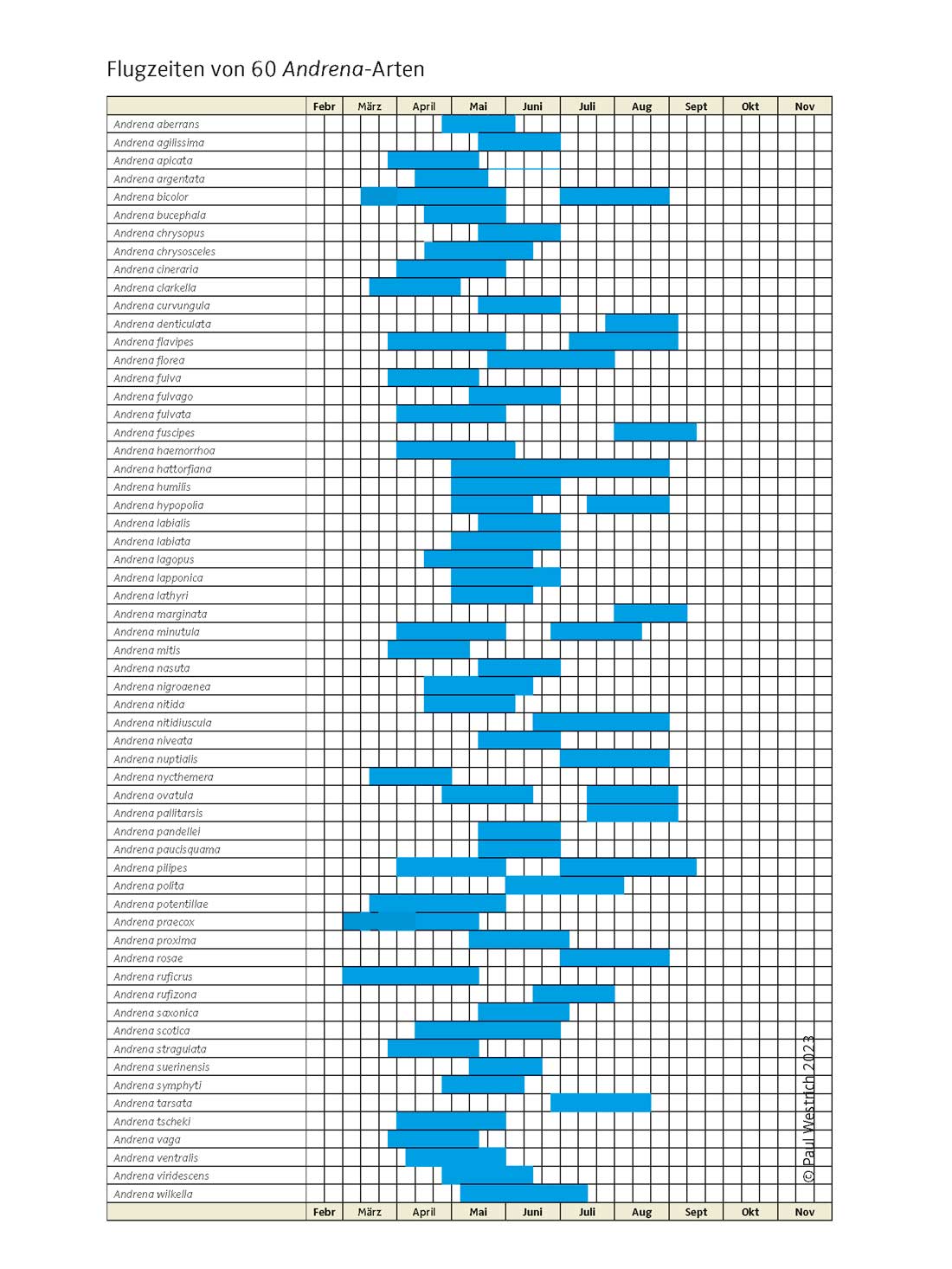 Aus Sammlungsexemplaren und eigenen Beobachtungen wurden die Flugzeiten von 60 Arten ermittelt. Die Erscheinungszeit kann wetterbedingt variieren. Als Folge des Klimawandels erscheinen manche Frühlingsarten heute früher als noch vor dreißig Jahren. [Großansicht durck Klick auf die Grafik oder alternativ PDF]